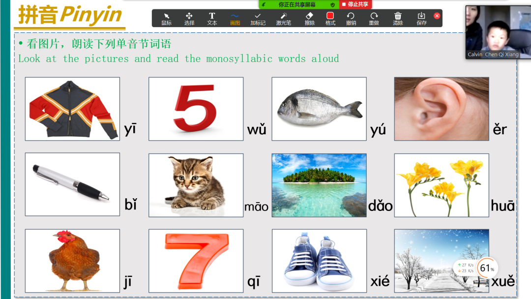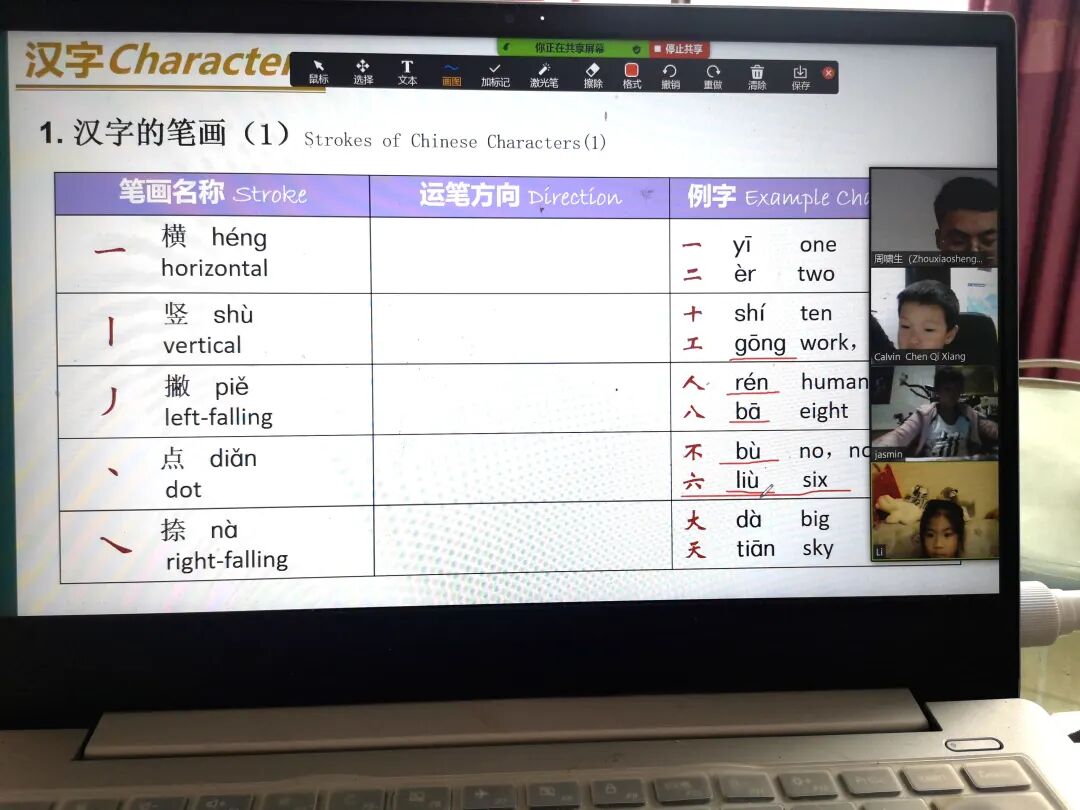 汉语教师周啸生以学生们的学习要求为出发点,精心准备教学内容和课堂活动。针对平均年龄在8岁的零基础班,周啸生通过线上唱歌的方式练习汉语拼音的拼读,除了利用经典儿歌《两只老虎》、《小星星》、《小螺号》等歌曲还利用抖音(TikTok)上最受青少年欢迎的网红歌曲《桥边姑娘》、《芒种》、《少年》等进行教学,小学员们非常喜欢。除此之外,周老师还模仿“网红主播”的身份和学员们话题互动、跳舞以及播放视频动画来增加“云端”课堂的丰富性和趣味性。在汉语水平考试(HSK)二级和四级辅导班,周啸生还细心记录学生汉语学习中自身存在的问题,并针对性地帮助学生解决这些问题,比如学员柯瑞麒(Riki Kahukiwa )写作部分较为薄弱;学员陈琪翔(Calvin Chen)上课爱走神,好动等。