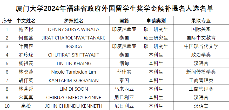1.若正选提名人选(详见《厦门大学2024年福建省政府外国留学生奖学金项目新生提名人选名单》)未按规定入学报到导致名额空缺,将由上述候补提名人选依次递补。